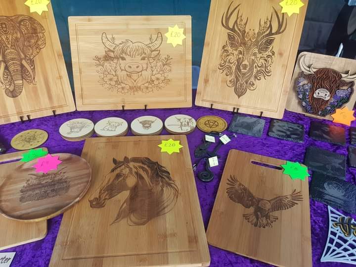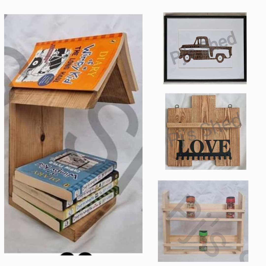 wooden items like spice racks, key hook plaques, gun cartridge pictures, feather pictures etc.